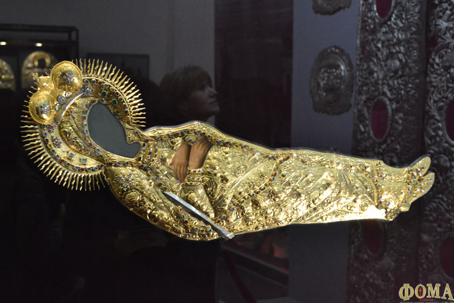 Також одним із головних експонатів є срібна позолочена риза (ХVIII ст.), яка прикрашала загублену чудотворну ікону Успіння Пресвятої Богородиці. «У 1920-і риза була вилучена з монастиря і передана київській конторі Держбанку. Пізніше вона була передана до фондів нашого музею», — сказала Ірина Мартинюк.